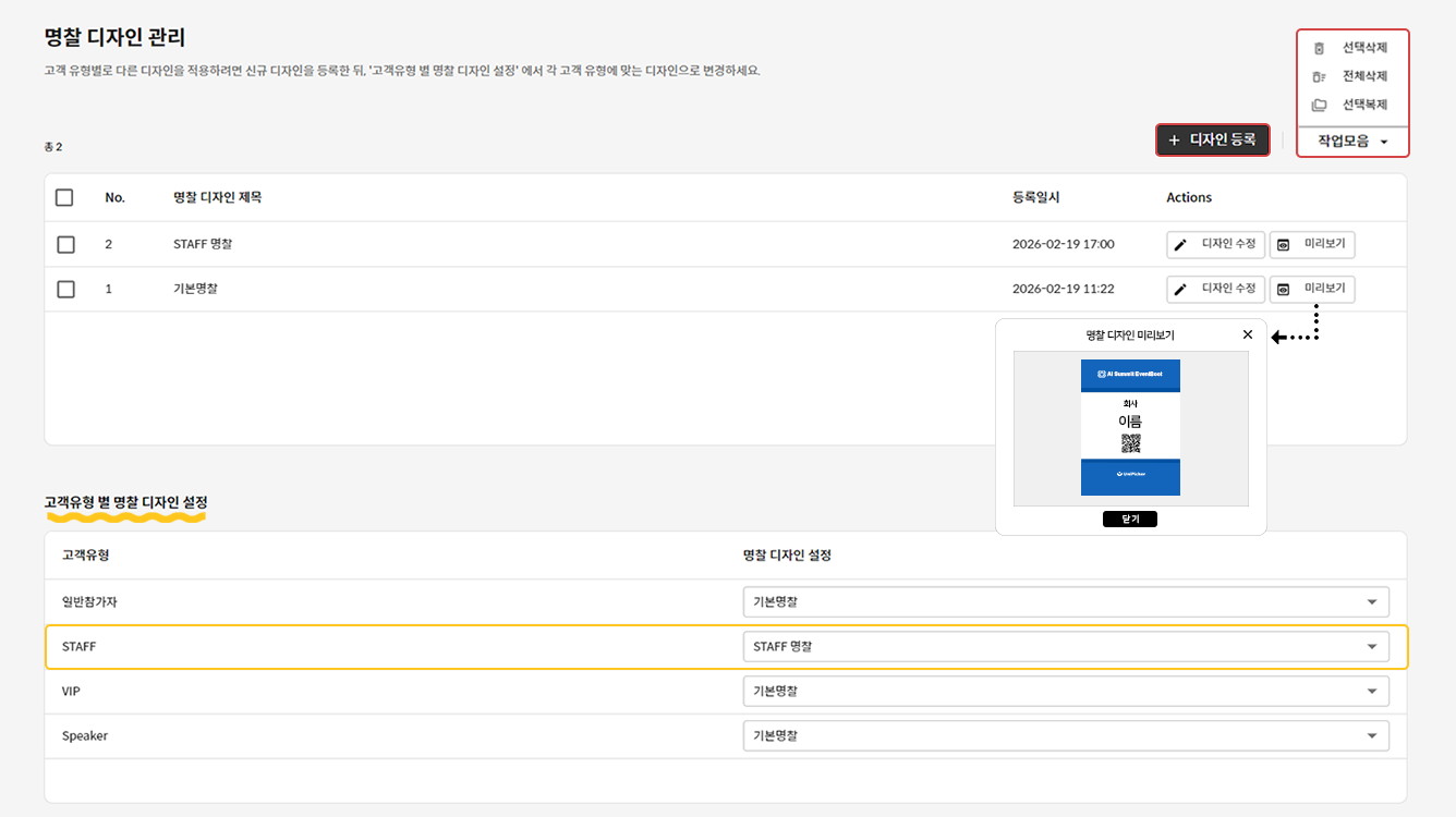 디자인 등록 버튼을 클릭하여 새로운 명찰 디자인을 추가합니다.